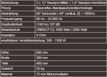 Die beiden 12" Neodymmitteltöner und der 1,4" Neodymhochtöner werden durch eine Passivweiche getrennt. Durch die spezielle Anord- nung der Mitteltöner werden trotz geringer Abmessung und geringen Gewichts hohe Richtwirkung und Empfindlichkeit erzielt. Große Reich- weiten bis 50m sind so trotz der geringen Baugröße möglich. Für den Betrieb von TB212-Lautsprechern empfiehlt sich die Verwendung eines Lautsprechermanagementsystems. Kostenloss Presets für ihr Lautsprechermanagementsystem werden von IBS-audio zur Ver- fügung gestellt. Das TB212 ist DAS TOPTEIL für Höchstleistungen!